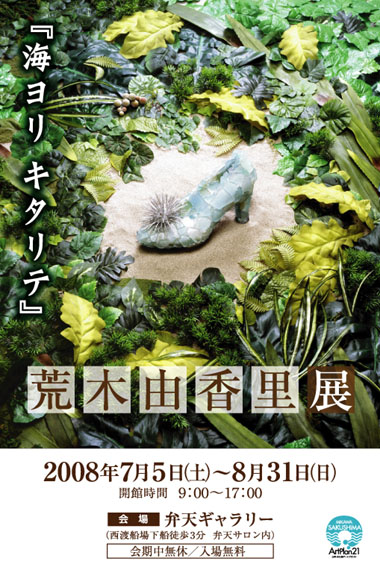 会期 : 7月5日(土)〜8月31日(日) 9:00〜17:00 会場 : 弁天サロン内ギャラリー (西渡船場下船徒歩3分) 会期中無休/入場無料 島で集めた素材にイノチを吹き込む? 佐久島でのはじめての展覧会となる 荒木由香里展 『海ヨリキタリテ』では、アーティストが佐久島で集めた素材を使った作品が中心に展示されます。浜辺で拾った貝殻やシーグラス、ウニの殻まで――、作品の中で生まれ変わった姿を見せてくれます。 女性らしい繊細さや可愛らしさと、強さ、不気味さが同居した不思議な作品は、打ち捨てられたものに新しい生命を与え続ける荒木ワールド全開です。みなさまのお運びを心からお待ち申しあげます。 【荒木由香里展 関連情報】 ■ 荒木由香里ワークショップ 6月22日(日) 14:00〜16:30 ■ ワークショップ作品展示 『サクシマのイキモノ展』 6月24日(火)〜8月31日(日) 6月30日以外無休 会場 : 弁天ギャラリー・創作の間 ワークショップで作った作品をみんなに見てもらおう! ■ 作品説明会+島びと交流会 申込み不要・参加無料 7月5日(土) 15:00〜17:00 会場/弁天サロン・寄り合いの間 荒木由香里を囲んでささやかなオープニング・パーティーを 開催します。お気軽にご参加くださいませ。 ■ 荒木由香里展に関するお問い合わせ先 オフィス・マッチング・モウル E-mail : office@m-mole.com /TEL : 0564-58-2787 。電話でのお問い合わせは土、日、祝日を除く午前10時〜午後6時。(担当/内藤・黒目) 【関連情報】 ● 荒木由香里展 『海ヨリキタリテ』 写真リポート ● 荒木由香里ワークショップ 開催のお知らせ ● 荒木由香里ワークショップ 写真リポート 【同時期開催】 ● 佐久島アート・ピクニック 2008 |