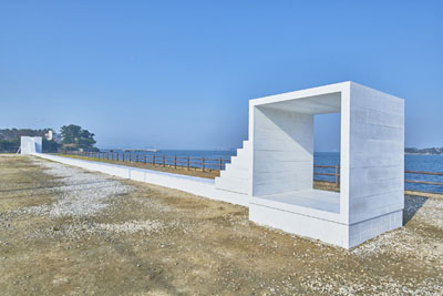 設計を担当した建築家・南川祐輝は、佐久島で『おひるねハウス』(2004)を手がけています。黒壁集落が印象的な西地区にある『おひるねハウス』が黒い作品となったように、周りにさえぎるものがない海上の公園に作られた『イーストハウス』は、太陽やその光を反射させる海の明るい日差しをイメージする白い作品になりました。対岸に互いを臨むことのできるふたつの作品は、異なる色彩でそれぞれ強い印象をもたらしています。