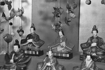 例年、観光客が少なくなるこの時期ですが、弁天サロンへ一歩足を踏み入れると華やかな雛飾りが出迎えてくれるもてなしで、佐久島来島の記憶を強く印象付けることを目指しています。3組の内裏雛を最上段に、学問の向上を願う菅原道真(天神様)、縁起物の七福神、長寿を願う翁と媼、多産を願う犬の他、幼子を抱いた母親の像や、芝居の一場面と思われる土人形など、ひとつひとつ眺めるのが実に楽しく、当時の人々が、素朴な土人形に託した願いや祈りが伝わってきます。