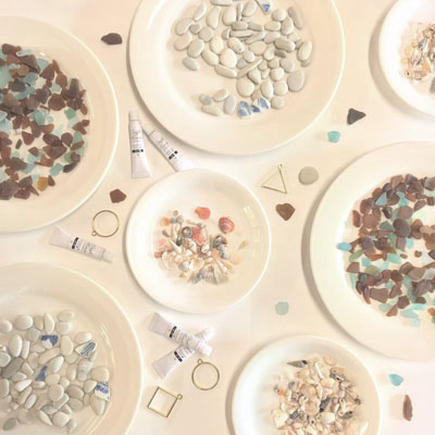 ネックレスとブローチのどちらかひとつを選び、選んだ型に島の素材をレイアウトしていきます。島の素材は事前に浜辺で集めた小石、シーグラス、シー陶器、貝殻など。小さな型にいろいろな素材を入れられるように、各素材は小さなサイズのものをわざわざ集めています。
